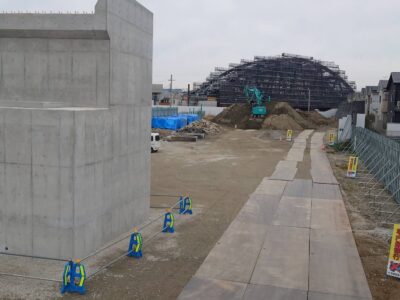 現場では建物の工事が着々と進んでおり、重機や足場が並ぶ迫力ある風景。 現場事務所では、図面の印刷や書類コピーなどでレンタル複合機が大活躍します📄