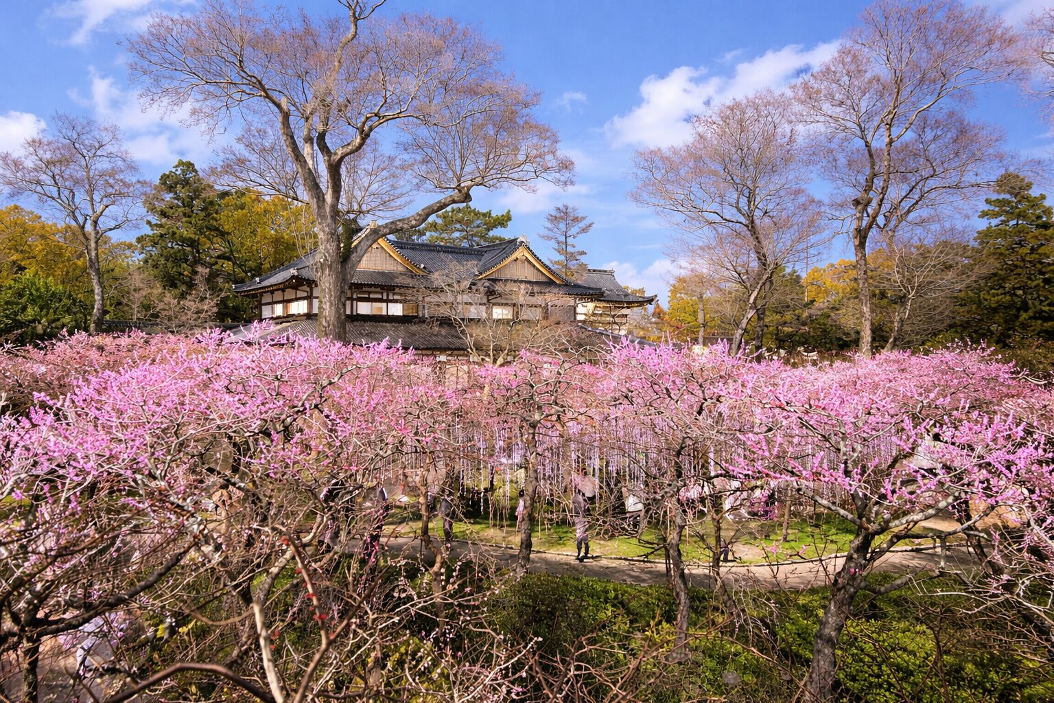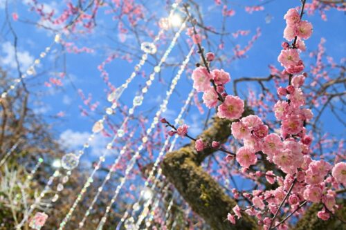 青空の下で広がる梅の景色はまさに春の訪れを感じる瞬間。